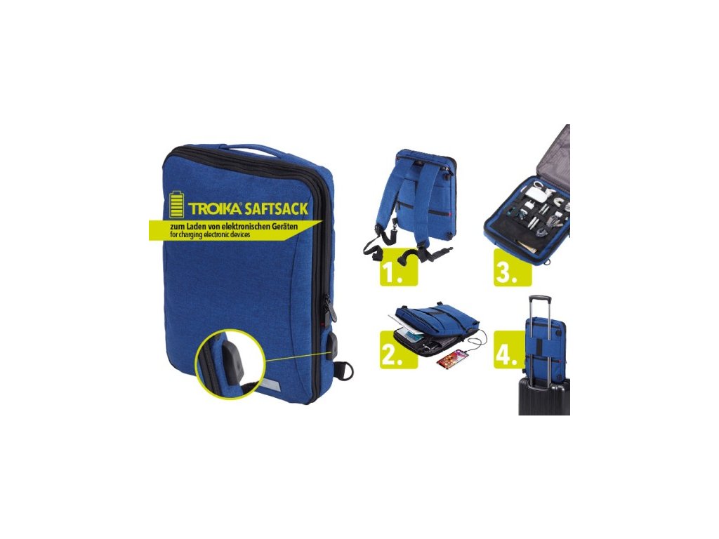 Batoh s tím jistým něčím - TROIKA SAFTSACK nabízí nejen praktický úložný prostor pro kabely, pera, smartphony, tablety, notebooky a příslušenství pro každodenní nošení, ale také propojuje napájecí zdroj připojený k integrovanému USB portu uvnitř batohu s tím na batohu.