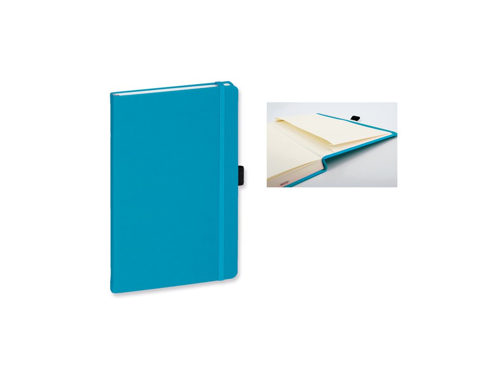 Poznámkový zápisník s gumičkou a vlepenou kapsou, 192 linkovaných stran. Růžová barva.