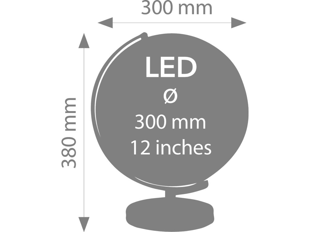 Atraktivní design: Matný dotykový LED glóbus STELLAR LIGHT TOUCH (průměr 30 cm) s osvětleným obrázkem mapy. Stříbrné pevninské oblasti a černé oceány vytvářejí fascinující kontrast. Popisky jsou v angličtině - kontinenty, státy, moře a oceány, města a pohoří, která jsou na povrchu zvýrazněny.