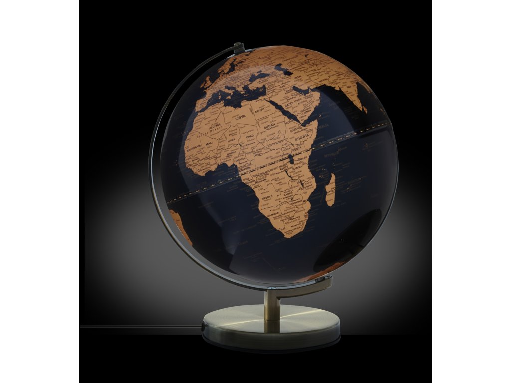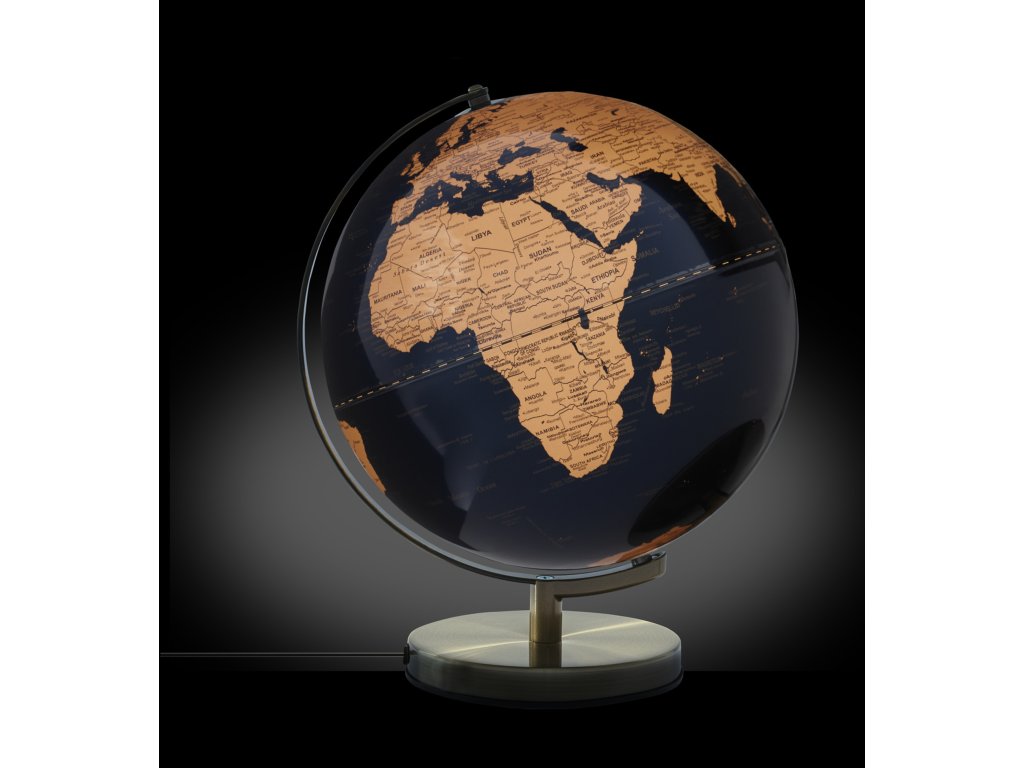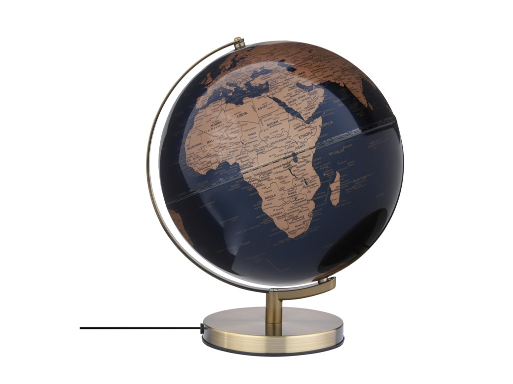 Glóbus o průměru 30 cm, integrované osvětlení se 3 světelnými režimy a dotykovou funkcí, nabíjecí zástrčka s GaN a technologie rychlého nabíjení Power Delivery součástí balení, 20W s USB-C a USB-A připojením, starozlatá základna z kartáčovaného kovu, reliéf mapy, pohyblivá osa, plast, kov, matný povrch, bronzová/tmavě modrá.