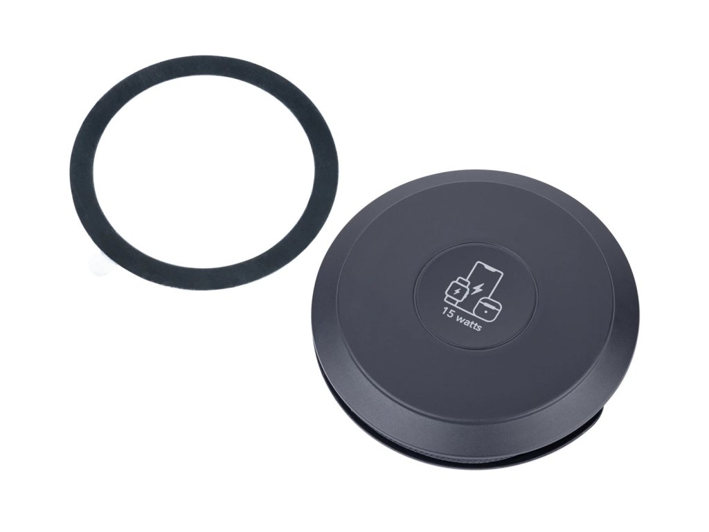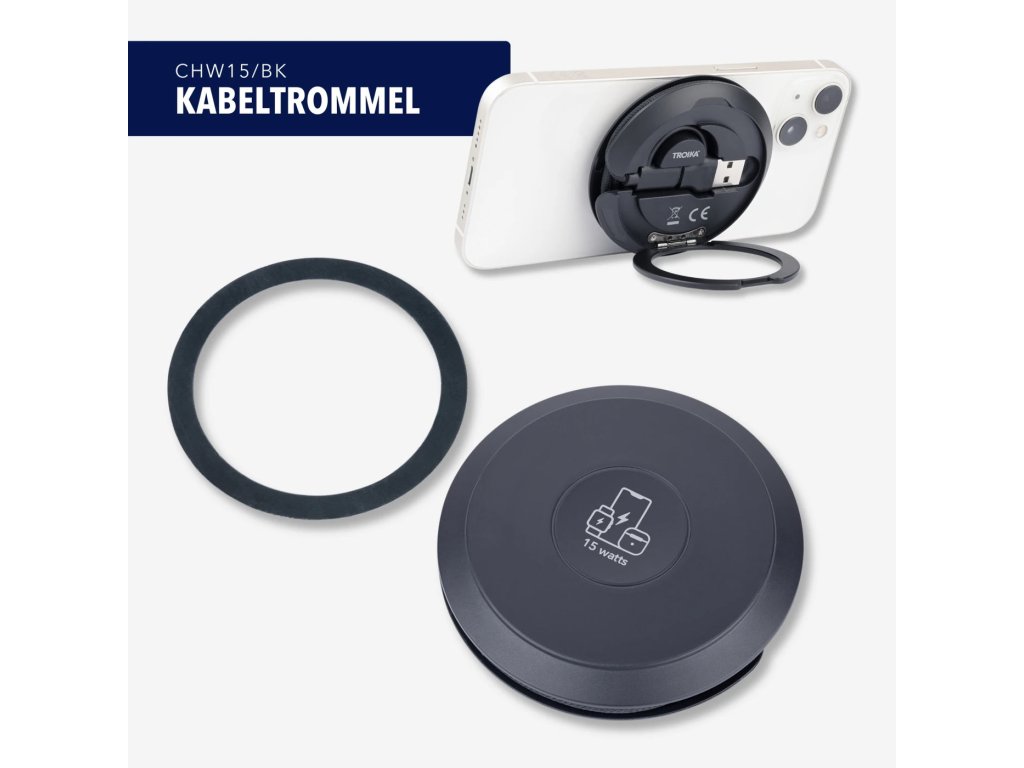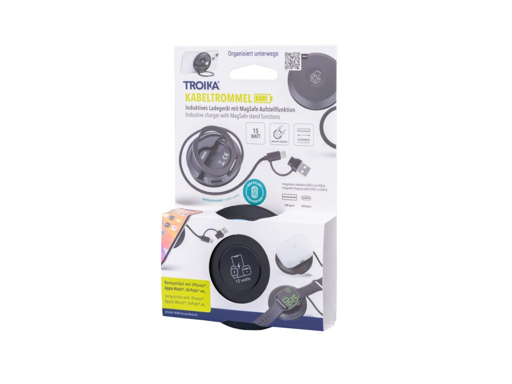 Bezdrátová nabíječka pro iPhone®, Apple Watch® a AirPods®, rychlé nabíjení až 15 W, kompatibilní s MagSafe, s integrovaným, snadno skladovatelným nabíjecím kabelem USB-C/USB-A (celková délka 60 cm), kabel potažený tkaninou (síťovaná struktura), recyklovaný polyester, výklopný kovový kroužek na zadní straně (funkce stojánku), obsahuje další kovový kroužek MagSafe s lepidlem 3M pro individuální připevnění ke všem běžným smartphonům, plast, recyklovaný polyester, černá