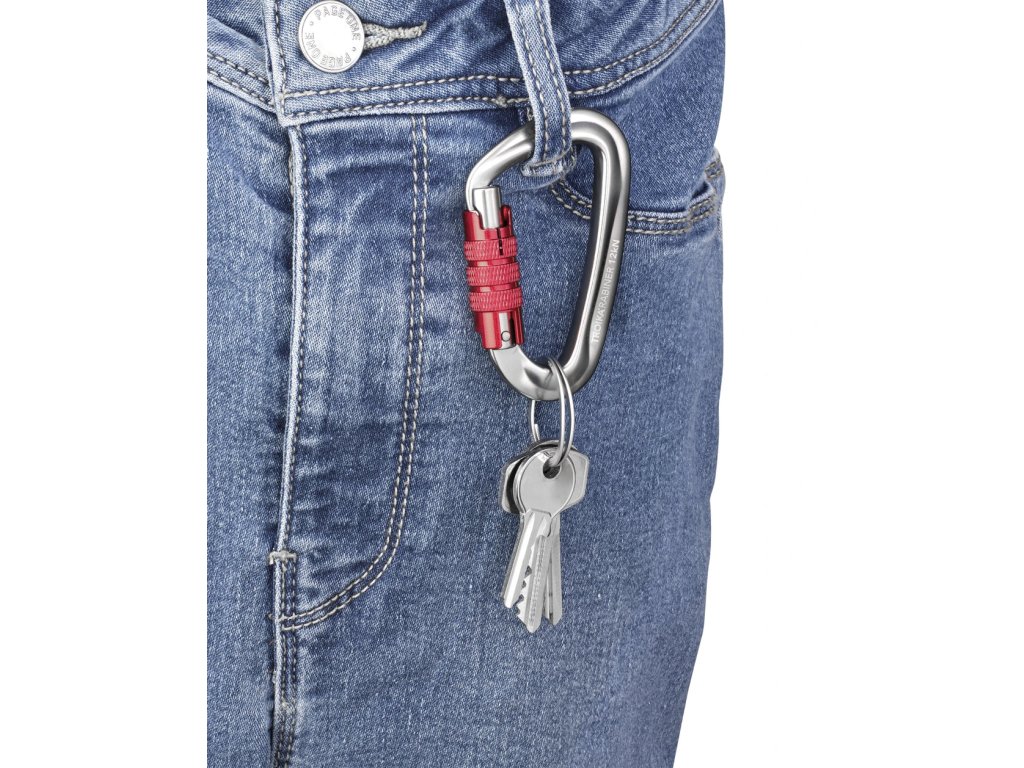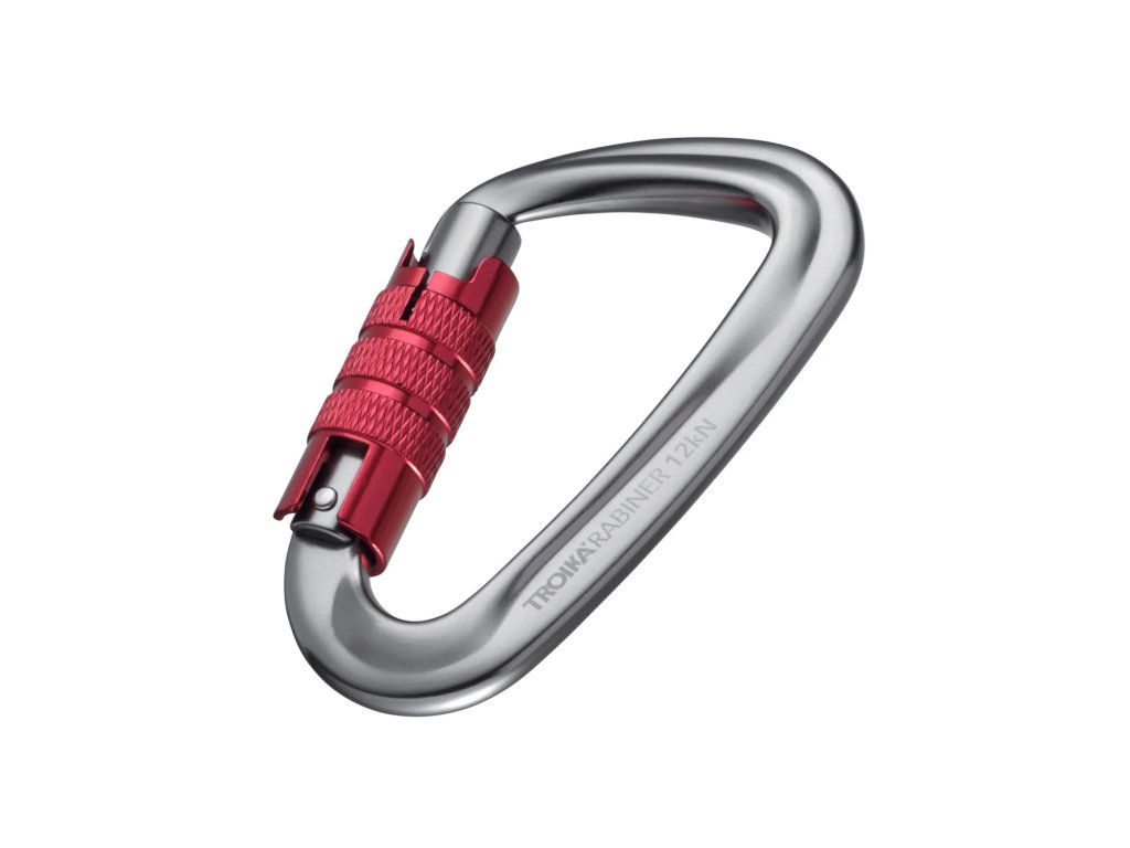 Karabina s bezpečnostním otočným zámkem, pevnost v tahu 12 kN, hliník 7075, eloxovaný, matný, červenostříbrná