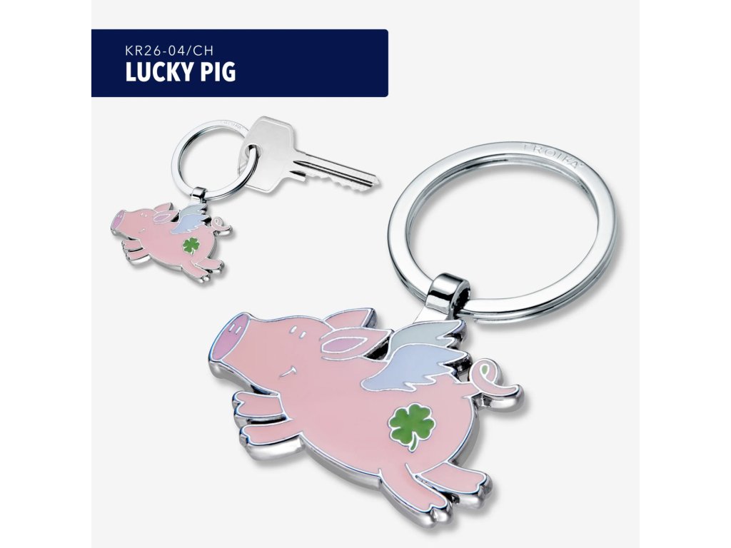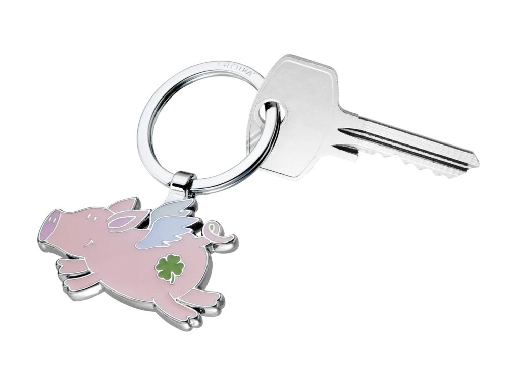Přívěsek na klíče, létající prasátko pro štěstí, smalt, litý kov, chromovaný, lesklý, růžový