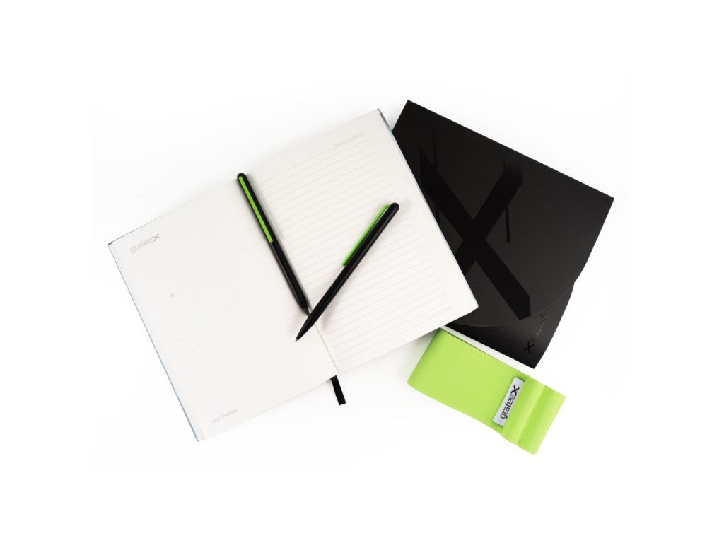 Psací sada Grafeex je určena pro ty, kteří rádi píší, skicují a zaznamenávají nápady pomocí inovativních a ekologických nástrojů. Zápisník má měkký obal a stránky vyrobené z kamenného papíru – revolučního papíru bez obsahu stromů a vody, který je elegantní a zároveň udržitelný.