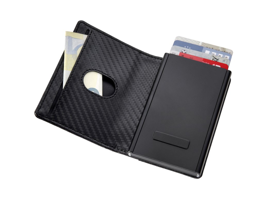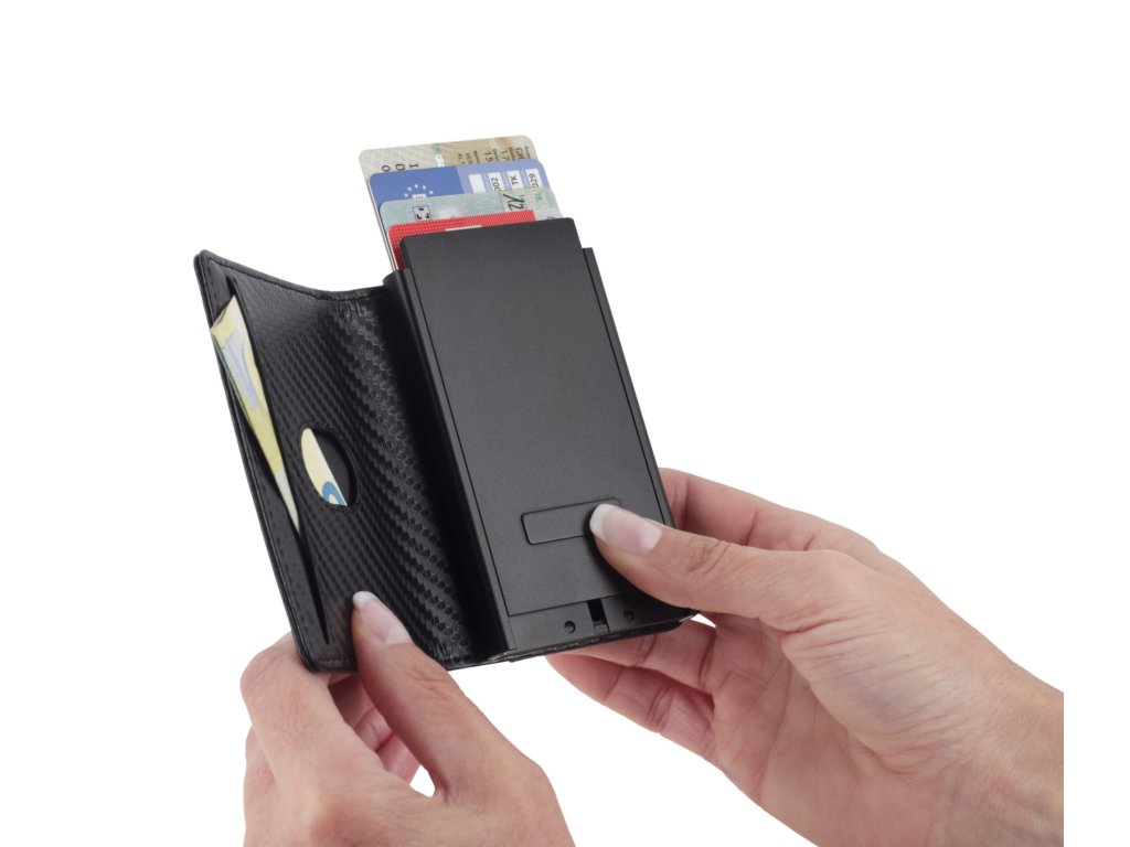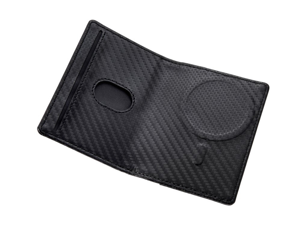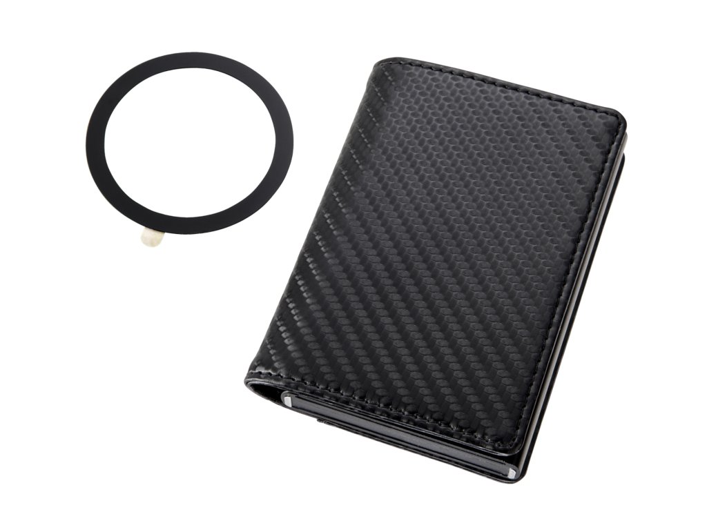 Peněženka 2 v 1 s odnímatelným pouzdrem na karty MagSafe, až pro šest karet (řidičský průkaz, občanský průkaz, kreditní karta atd.), skrytý posuvný mechanismus na přední straně, RFID ochrana (proti skenování), silný magnet (N52) na zadní straně pro samostatné připevnění k telefonu, peněženka s přihrádkou na bankovky a integrovaným kovovým kroužkem pro připevnění pouzdra na karty uvnitř, zadní slot pro parkovací lístky, účtenky atd., další samolepicí kovový kroužek MagSafe s lepicí plochou 3M pro individuální připevnění, např. na všechny běžné chytré telefony, pouzdra atd. součástí balení, imitace kůže, kov, karbonový vzhled