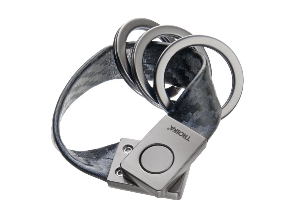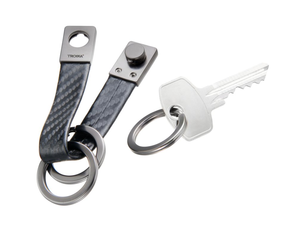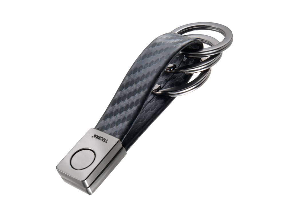 Klíčenka s hranatým „otočným zapínáním“, poutko z umělé kůže v karbonovém vzhledu, 3 klíčenky, kov, polyuretan, matný, karbonový vzhled