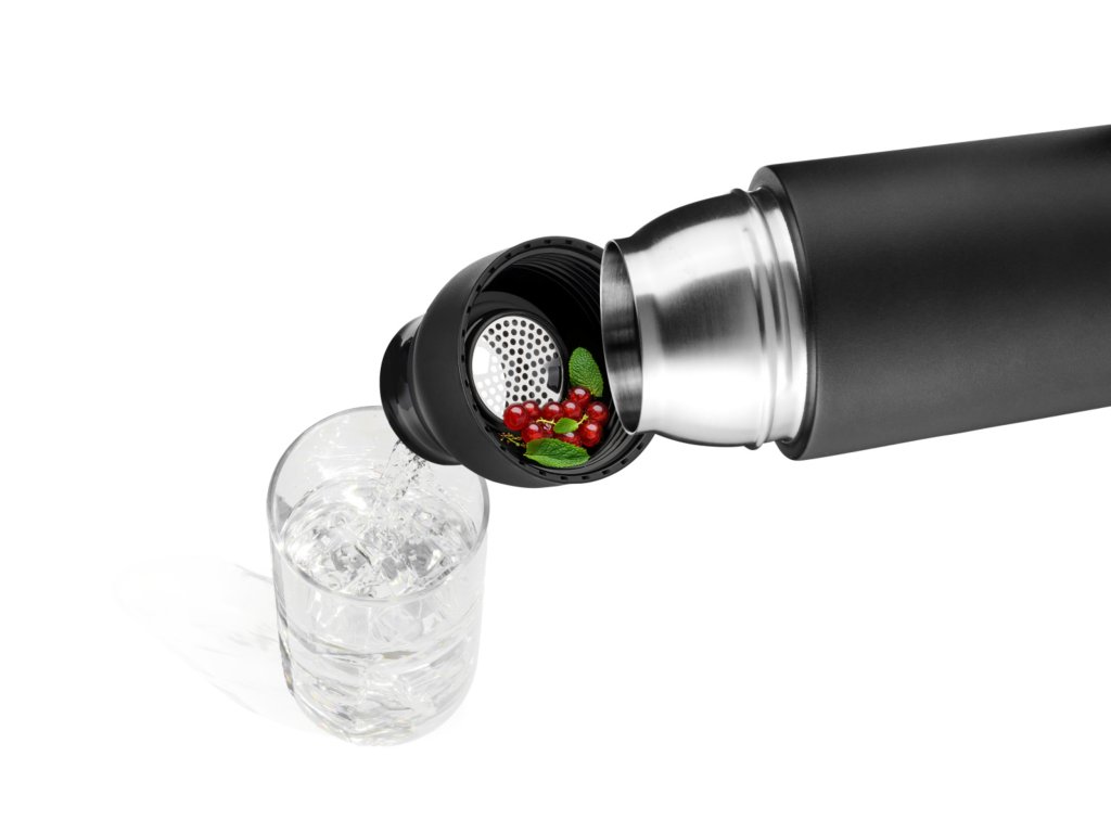 Praktické zavírání jednou rukou na cvaknutí – pro rychlé pití na cestách, ať už při sportu, v kanceláři nebo na cestách. Všestranná a promyšlená – velký přídavný otvor pro čaj, bylinky, zázvor nebo kostky ledu. Vyrobeno z vysoce kvalitní nerezové oceli, matně práškově lakovaná, s praktickou dvojitou karabinou na cesty.