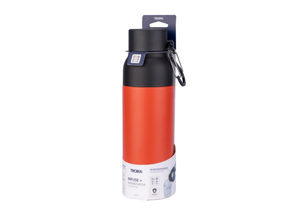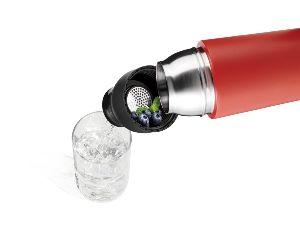 Praktické zavírání jednou rukou na cvaknutí – pro rychlé pití na cestách, ať už při sportu, v kanceláři nebo na cestách. Všestranná a promyšlená – velký přídavný otvor pro čaj, bylinky, zázvor nebo kostky ledu. Vyrobeno z vysoce kvalitní nerezové oceli, matně práškově lakovaná, s praktickou dvojitou karabinou na cesty.