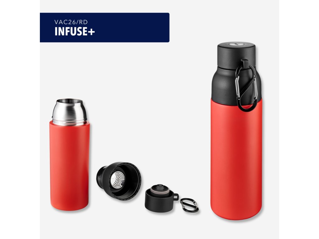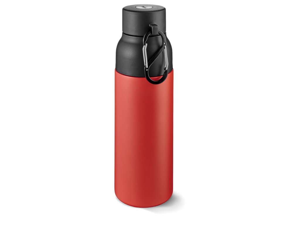 Termoska s víčkem otevíratelným jednou rukou, dvoustěnná vakuová izolace, objem 550 ml, vhodná pro styk s potravinami, široký šroubovací uzávěr pro přidávání kostek ledu atd., s dvojitou karabinou pro připevnění k taškám nebo klíčům, nepropustná, nerezová ocel 201, nerezová ocel 304, plast, matný, červeno-černá.